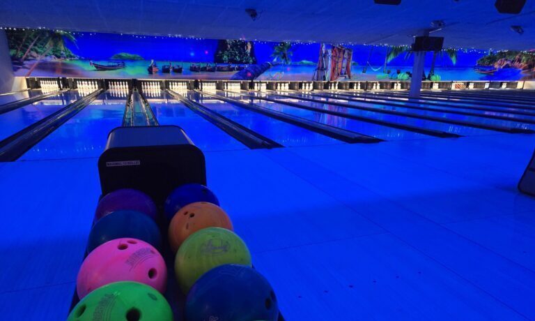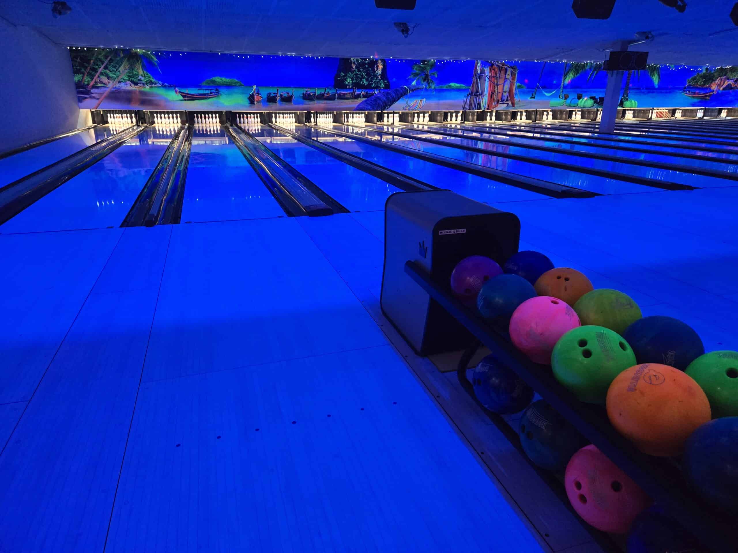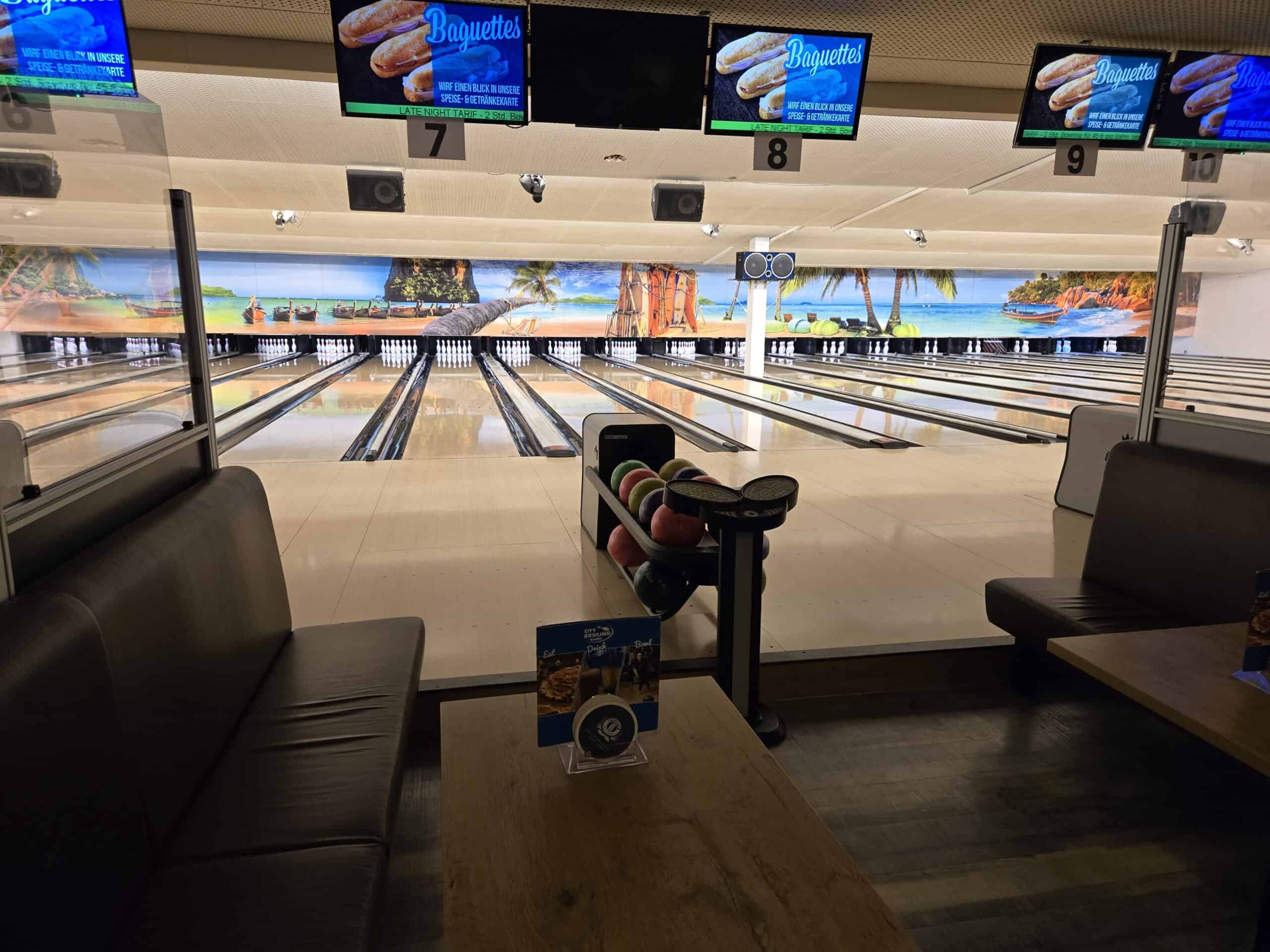 Wenn Style auf Funktion trifft – diese leuchtenden Drucke werden definitiv für Aufmerksamkeit sorgen und wurden mittels einer Klett-Flausch Verbindung entlang der 35,0 m Bowlingbahn aufgespannt.